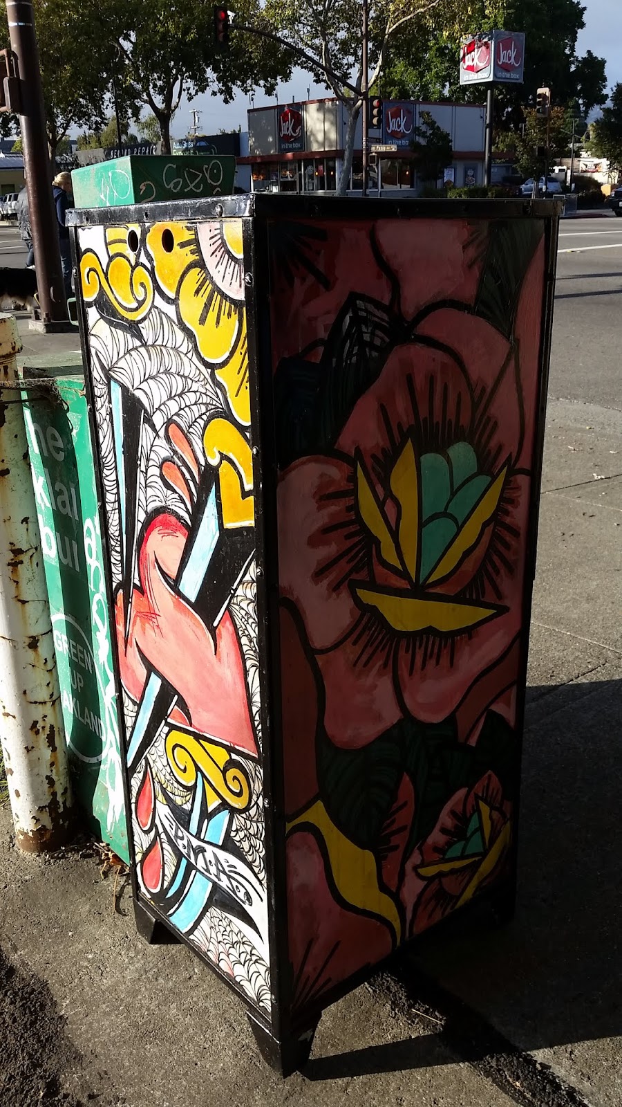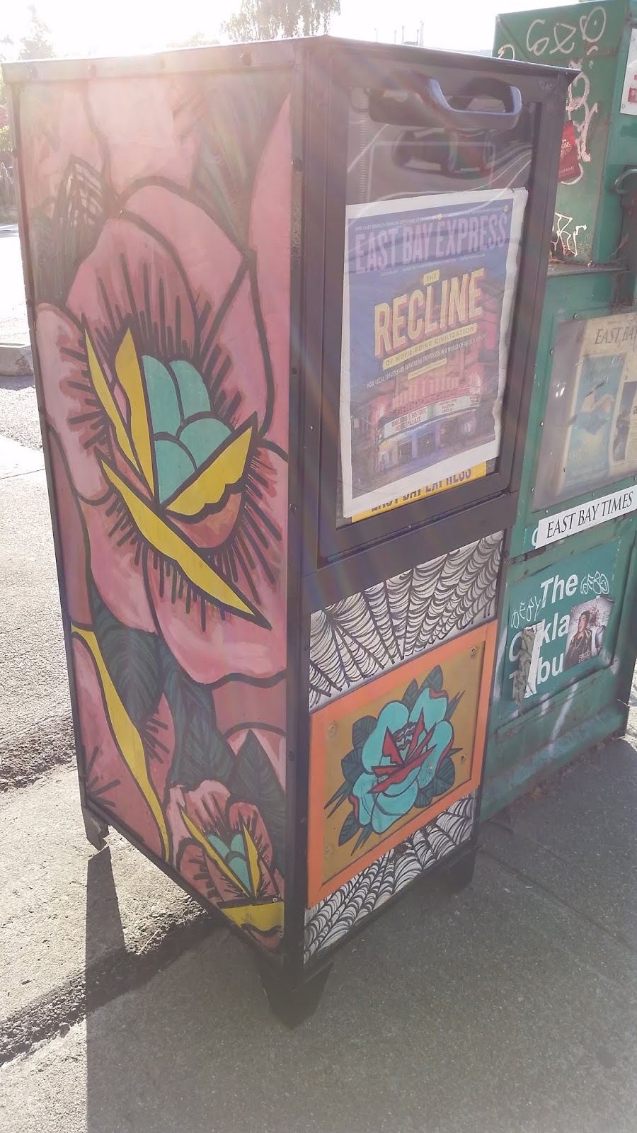 Hearts and Daggers Jun 19 Written By What a pretty newspaper box in the sunshine! Artist is pma. #bayarea#California#dagger#eastbayexpress#FinerPointsOakland#flower#garbagecanart#heart#JackLondonSquare#newspaper#newspaperbox#oakland#pma#spiderweb#streetart#trashcanart